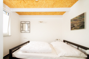 Das große Schlafzimmer ist ausgestattet mit Doppelbett (180 x 200 cm), im kleinen Schlafzimmer befindet sich ein Doppelbett (160 x 200 cm). Badezimmer mit Dusche, Badewanne und WC befindet sich ebenfalls im EG. Es steht ein Pkw-Stellplatz direkt am Haus zur Verfügung. W-LAN steht Ihnen kostenfrei zur Verfügung. Kinderstuhl und Kinderbett ist vorhanden.